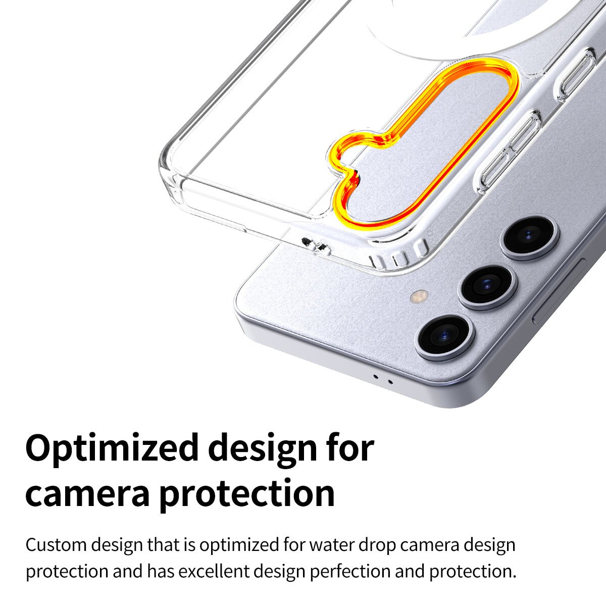 Husa prezinta margini ridicate pentru ecran si o baza de protectie pentru camera, asigurandu-se ca smartphone-ul evita contactul direct cu solul atunci cand este asezat.