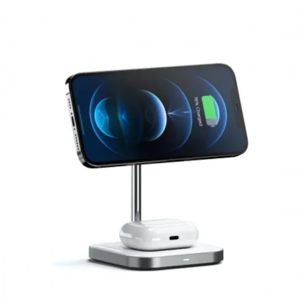 Suport de încărcare magnetic și wireless Satechi 2in1 din aluminiu pentru încărcarea rapidă și eficientă a căștilor iPhone sau AirPods.